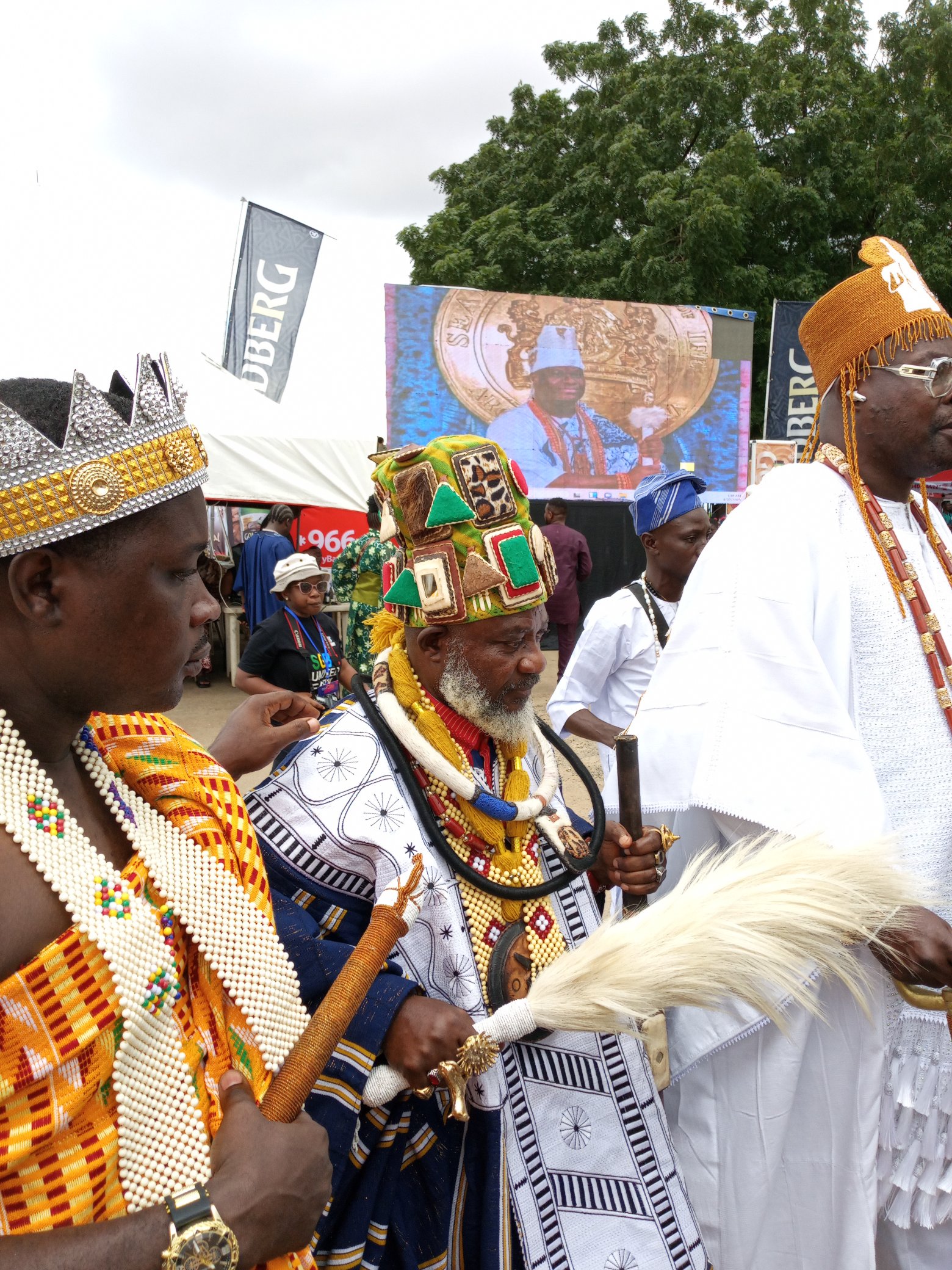 Their mission is both ceremonial and spiritual: to pay homage to the Oonirisha (a reverent title for the Ooni, meaning “the living Orisa”) before he dons the sacred Aare crown. Moving in synchronized steps, they chant ancient praise songs, beat ceremonial drums, and raise their staffs to cleanse the path. Their deep, resonant invocations are said to awaken the spirits of the ancestors and call down blessings from the pantheon of Orisa.