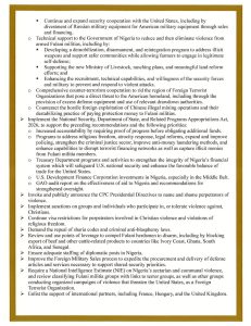 Other proposals include demanding the repeal of Sharia-based criminal codes and anti-blasphemy laws deemed discriminatory, commissioning a National Intelligence Estimate on Nigeria’s sectarian violence, and reviewing whether certain armed groups should be designated as Foreign Terrorist Organizations.