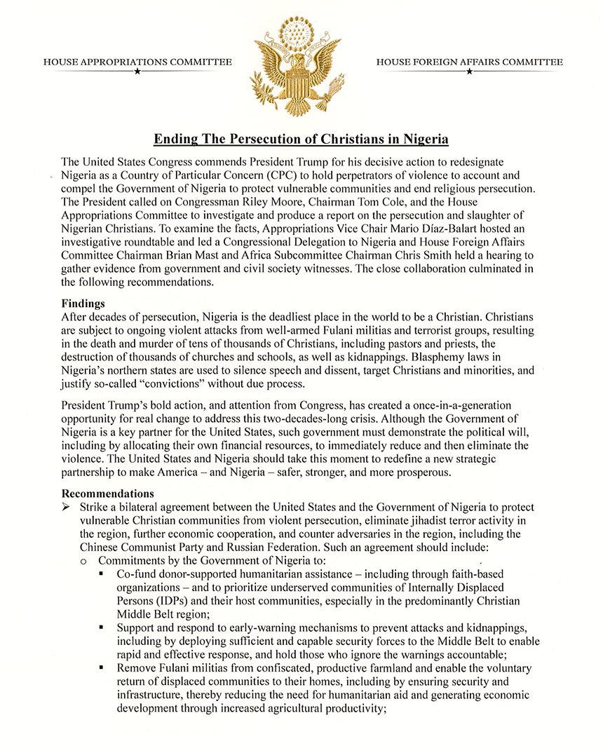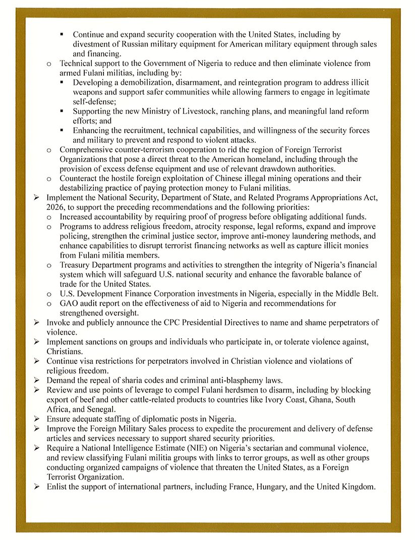 Other proposals include demanding the repeal of Sharia-based criminal codes and anti-blasphemy laws deemed discriminatory, commissioning a National Intelligence Estimate on Nigeria’s sectarian violence, and reviewing whether certain armed groups should be designated as Foreign Terrorist Organizations.