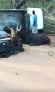 The front wind shield of the truck was riddled with bullet holes as they fired several shots at the truck. As shown in a video taken at the scene which has gone viral, some of the cows were killed by the gun shots as there blood spilled on the ground beside the road, while the truck fell inside the road drainage during the attack.